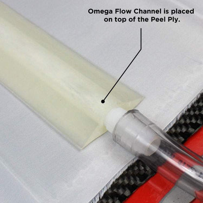 Omega Flow Lines are designed for use under the bag in resin infusion applications, replacing spiral tubing. Omega Flow Lines incorporate an ''Omega section'' internally to transport resin along the surface and into the part. Simply attach your resin feed lines to the Omega Channel. Once the channel is full, resin will be dispersed into your part. Omega Flow Lines are made from translucent silicone rubber and are reusable. Apply mold release to the inside of the channel prior to each use and thoroughly clean the channel once removed from your part. These flow lines leave minimal or no mark off on the part when used in conjunction with our flow media and peel ply.