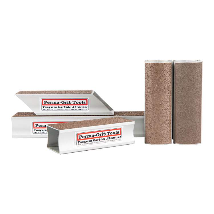Sheets of tungsten carbide grit are bonded to an anodized aluminum extrusion for each block. They are designed to be lightweight, clean, and easy to handle for sanding fiberglass, carbon fiber, and other composite materials.